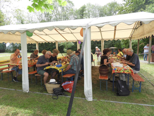 Nachdem am Grill die mitge-brachten Stücke gebruzeltwaren und das von den Mit-gliedern der DFG mitgebrachteSpeisenbuffet erkundet wurde,konnte das große Schlemmenbeginnen.Die gute Vorbereitung durch denBoule-Club (Zelt, Bänke, Geschirr,Getränke) ließ uns fröhlich speisen.