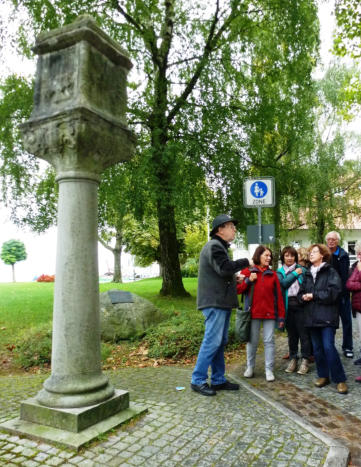 und erklärte uns, was noch an Gebäuden und Denk-